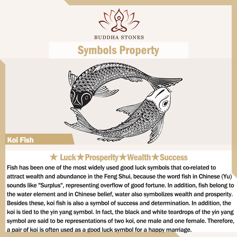 Fische zählen seit jeher zu den beliebtesten Glückssymbolen im Feng Shui und stehen für Reichtum und Fülle. Das chinesische Wort für Fisch (Yu) klingt ähnlich wie „Überschuss“ und symbolisiert somit Glück im Überfluss. Zudem gehören Fische zum Element Wasser, und Wasser steht im chinesischen Glauben ebenfalls für Wohlstand und Reichtum. Darüber hinaus symbolisiert der Koi Erfolg und Entschlossenheit. Er ist außerdem mit dem Yin-Yang-Symbol verbunden. Die schwarzen und weißen Tropfen des Yin-Yang-Symbols sollen zwei Kois darstellen, einen männlichen und einen weiblichen. Daher gilt ein Koi-Paar oft als Glückssymbol für eine glückliche Ehe.