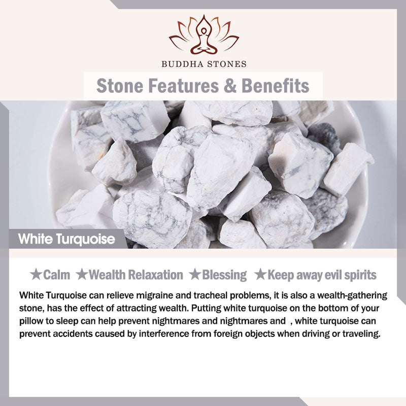 Weißes Türkis kann Migräne und Luftröhrenprobleme lindern, es ist auch ein Stein, der Reichtum ansammelt, und hat die Wirkung, Reichtum anzuziehen. Wenn Sie zum Schlafen weißes Türkis auf die Unterseite Ihres Kissens legen, können Sie Albträume und Alpträume verhindern, und weißes Türkis kann Unfälle verhindern, die durch Störungen durch Fremdkörper beim Autofahren oder Reisen verursacht werden.