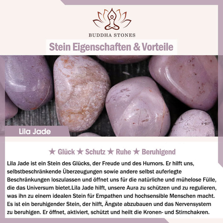 Lila Jade ist ein Stein des Glücks, der Freude und des Humors. Es hilft uns, selbstlimitierende Überzeugungen und andere selbst auferlegte Einschränkungen loszulassen und öffnet uns für die natürliche und mühelose Fülle, die das Universum bietet.
