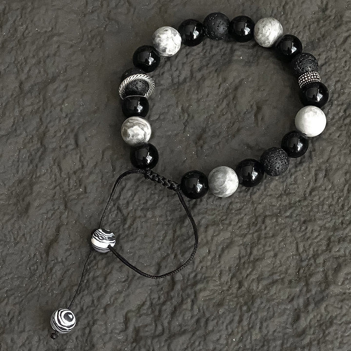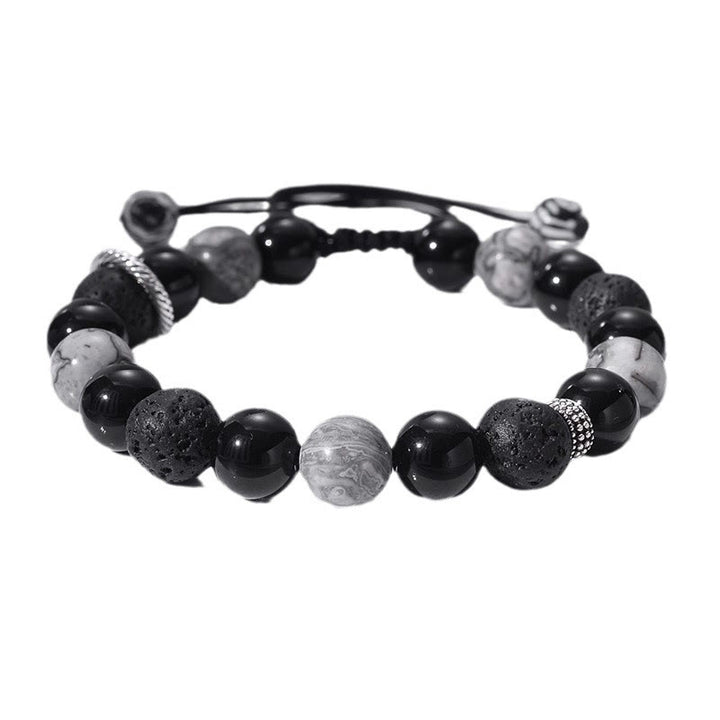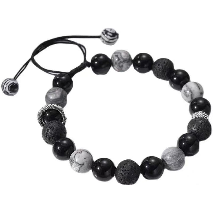 - Material: Lavastein, schwarzer Obsidian, Picasso-Jaspis, Legierung, Seil