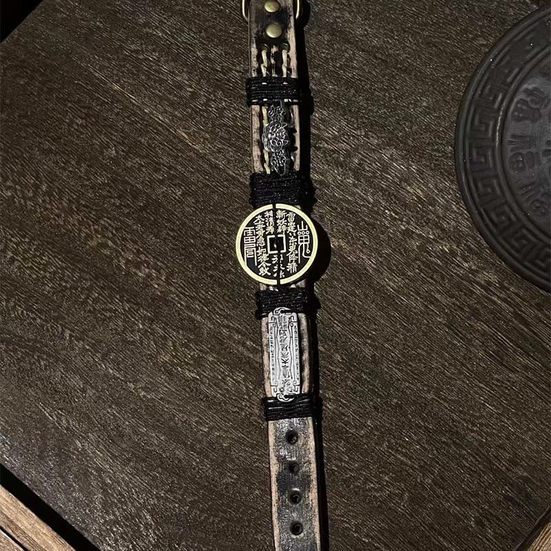 Links und rechts sind vierstellige Zeichen, auch bekannt als „Taoistische Rune“. Die Rune wird als „Donnerbefehl zum Töten von Geistern“ interpretiert, links steht „Lei Ling“ (chinesisch: 雷令) und rechts „Geister töten“. Der sogenannte „Berggeist“ bedeutet eigentlich „Geister töten“ (chinesisch: 杀鬼), und „Geister“ bedeutet „töten“. Die ursprüngliche Bedeutung ist, dass drei Donnerpillen auf den Kopf des „Geistes“ gelegt werden und die Pillen Flammen erzeugen. Die Bedeutung von „Blitz trifft Geister, entzündet ein Feuer und tötet sie“ ist kein piktografisches Zeichen für „Berg“. Es gibt ein anderes Sprichwort: „. „Berggeist“ ist der sogenannte Berggott, da er vom Kaiser des Himmels nicht offiziell heiliggesprochen wurde, daher wird er immer noch „Berggeist“ genannt.“