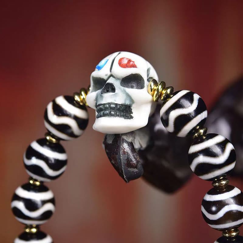 Der Herr des Leichenwaldes ist der Hauptgott, der für die Himmelsbegräbnisstätten in Tibet zuständig ist und als „König der Geister“ bekannt ist. Knochen und Totenköpfe spielen daher in der tibetischen Symbolik eine wichtige Rolle. Tibeter glauben fest daran, dass das Tragen einer Leiche Seuchen vertreiben und böse Geister unterdrücken kann. Der Herr des Leichenwaldes symbolisiert zudem für alle Lebewesen die Vergänglichkeit aller Dinge auf der Welt. Das Tragen von Schmuck, der den Herrn des Leichenwaldes symbolisiert, erinnert uns daran, im Hier und Jetzt zu leben und nichts von Dauer zu sein.