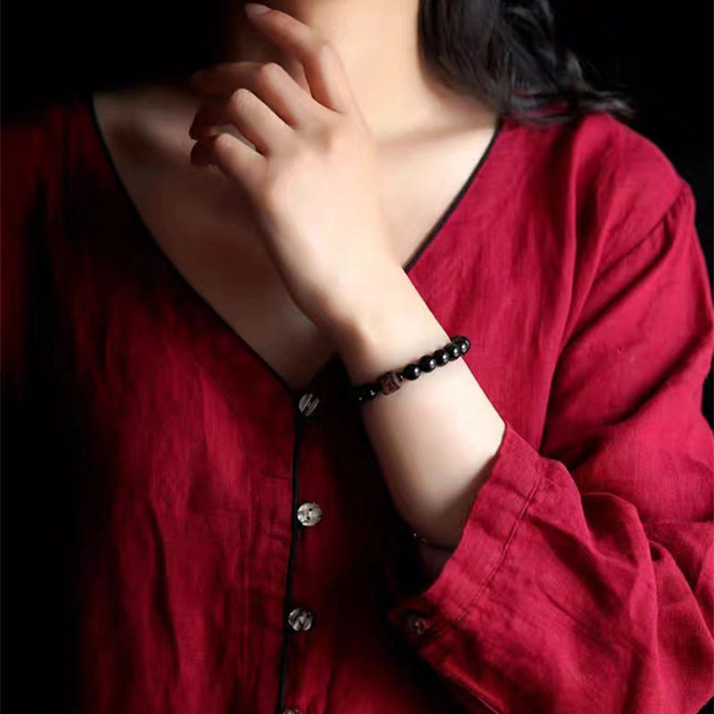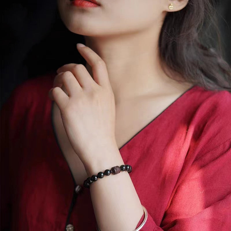 - Material: Goldglänzender Obsidian, silberglänzender Obsidian, schwarzer Obsidian, Regenbogenobsidian, kleines Blatt rotes Sandelholz, Zinnober