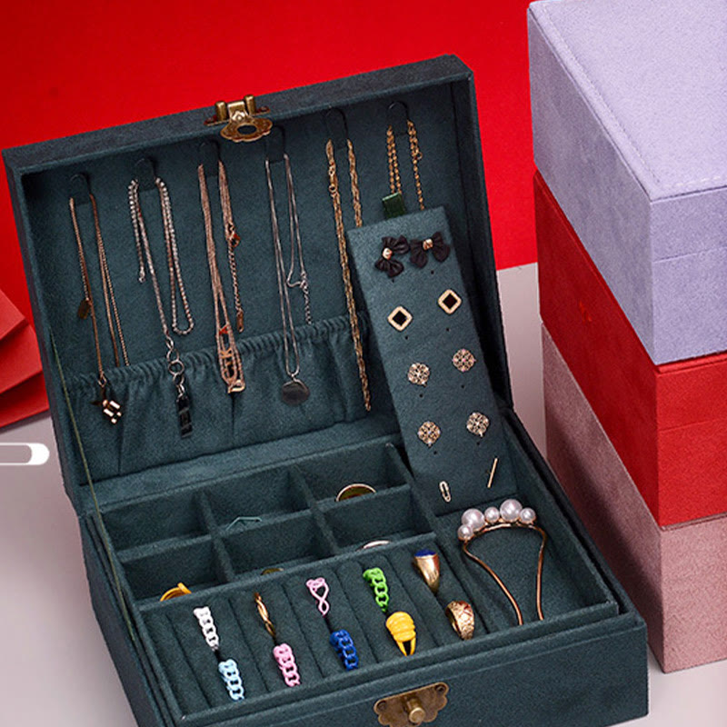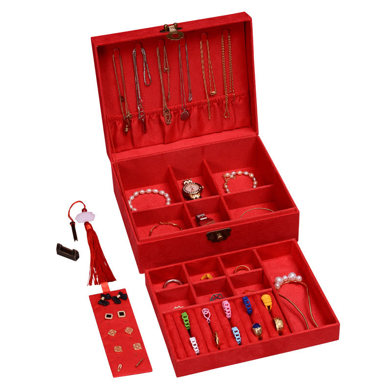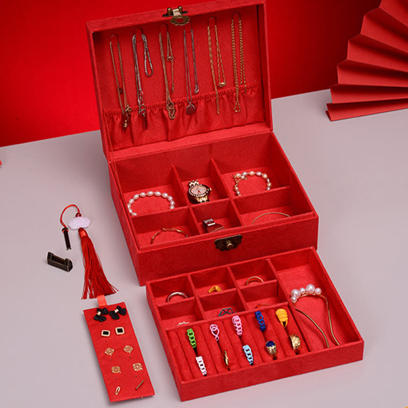 Buddha Stones, schlichtes Design, Schmuckkästchen, Organizer, zweilagige Schmuck-Aufbewahrungsbox, Flanell-Box mit Schloss - Rot23*19*6,5cm - image 19