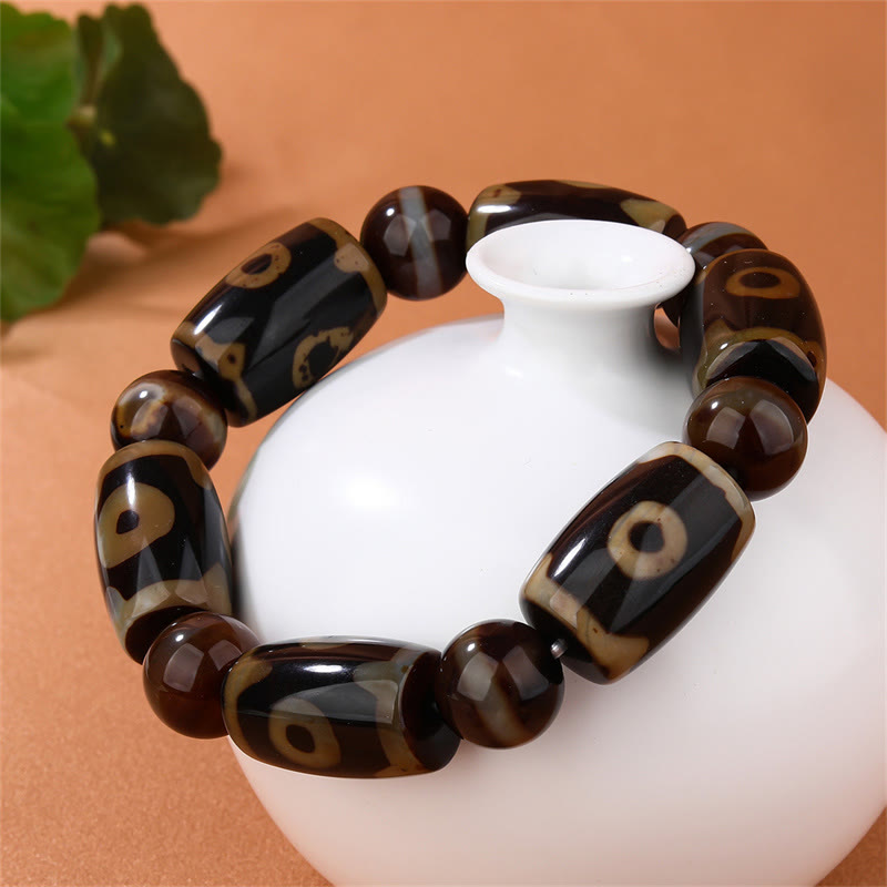 Die dreiäugige Dzi-Perle begünstigt drei verschiedene Lebensziele. Dabei handelt es sich um Bestrebungen in Bezug auf Karrierewachstum, Wohlstand und Langlebigkeit.
