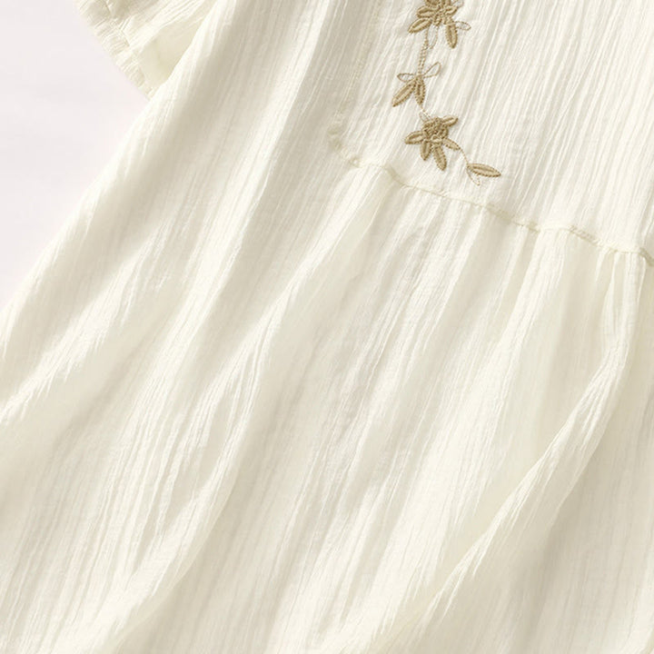 Buddha Stones Sommer-Midikleid aus legerer Baumwolle und Leinen mit schlichter Stickerei, doppellagig, kurzärmelig