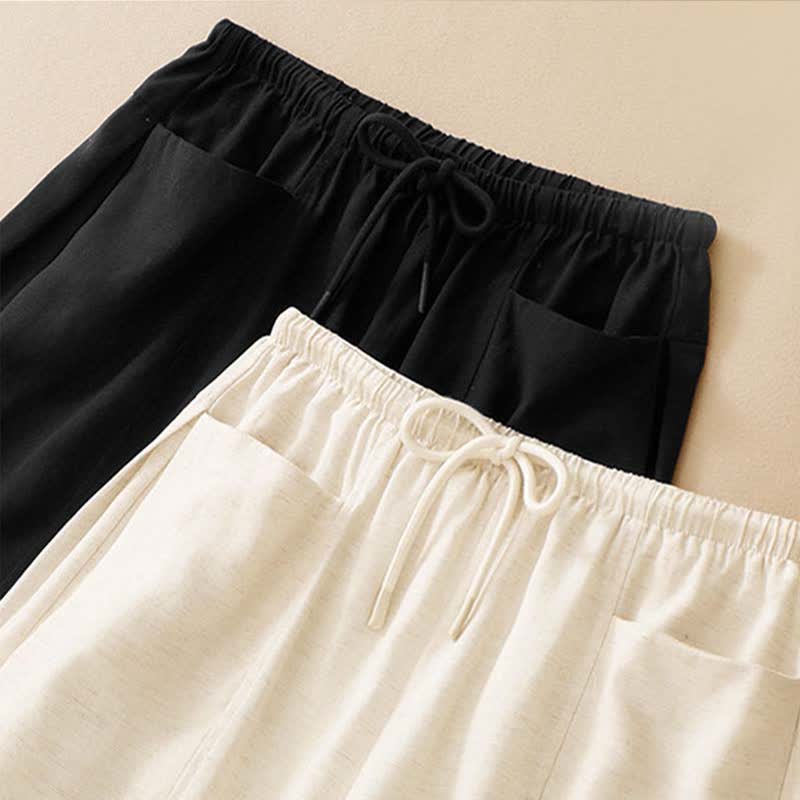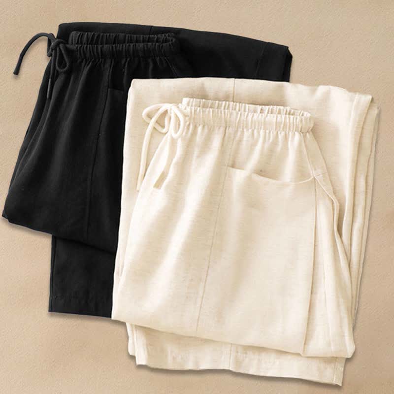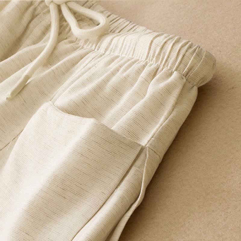 - Schlichtes Design: Lässiger, gerader Schnitt mit weitem Bein und mittelhohem Bund, elastischem Kordelzug und großen aufgesetzten Taschen. Minimalistische, lässige Ästhetik, die Elemente von Haremshosen und weiten Beinen vereint und sich so mühelos im Alltag tragen lässt.