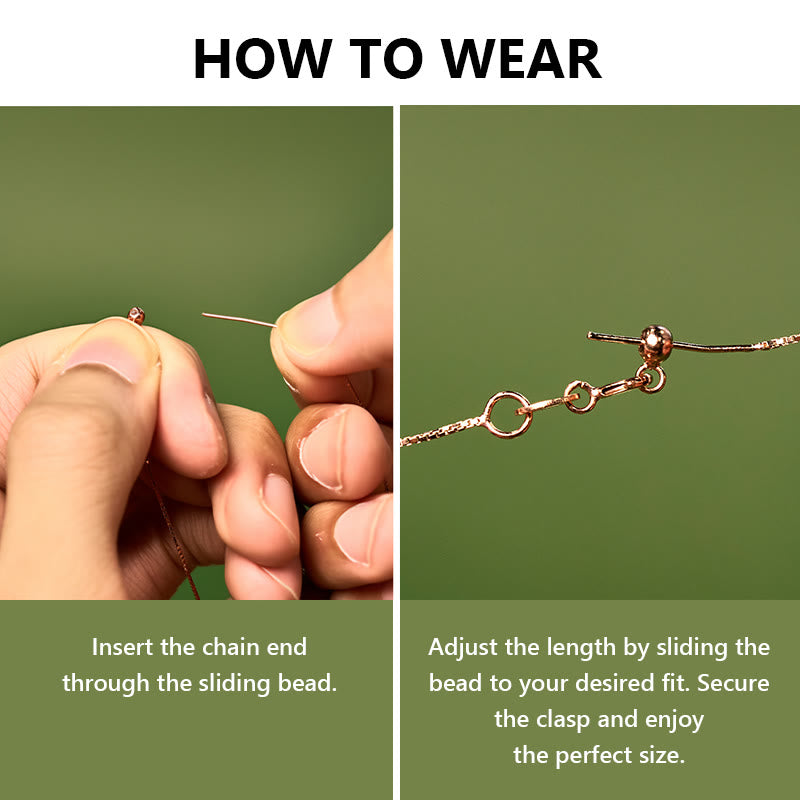Halten Sie die Schiebeperle mit einer Hand fest und ziehen Sie mit der anderen Hand vorsichtig an den Kettenenden, um das Armband/die Halskette enger oder lockerer zu machen.