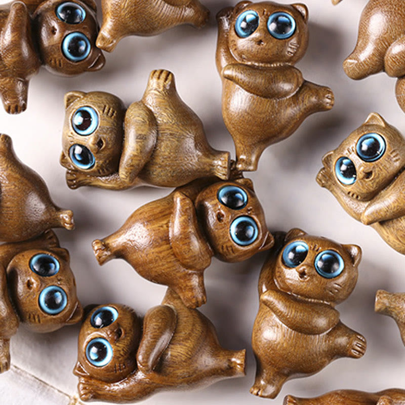 Buddha Stones Mini-Tanzende Katze aus grünem Sandelholz mit Gravur, positive Schreibtischdekoration