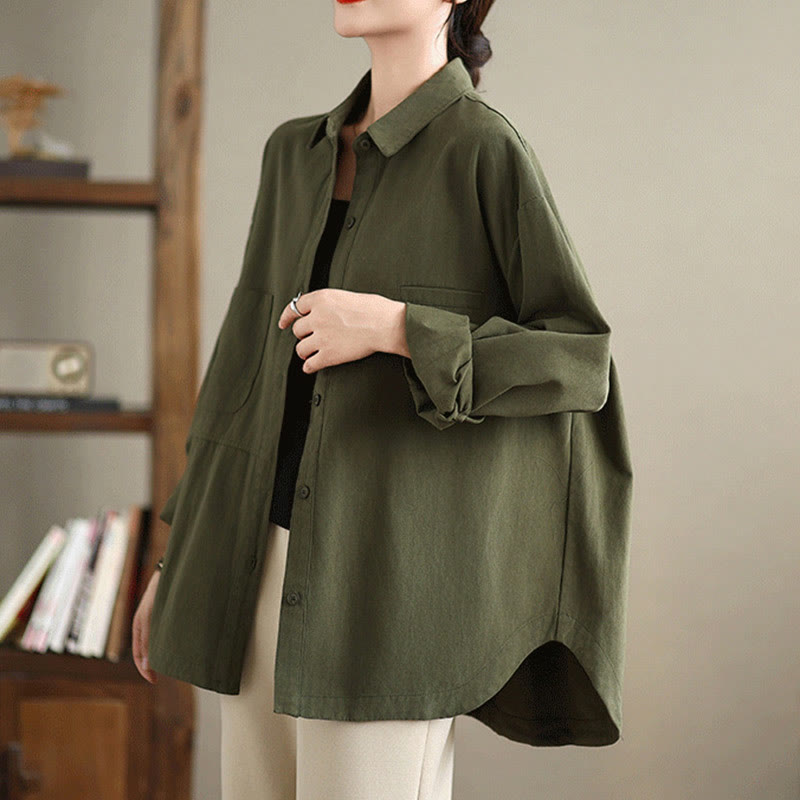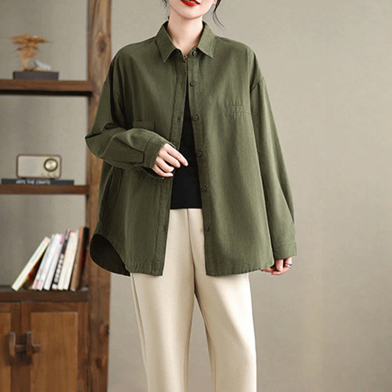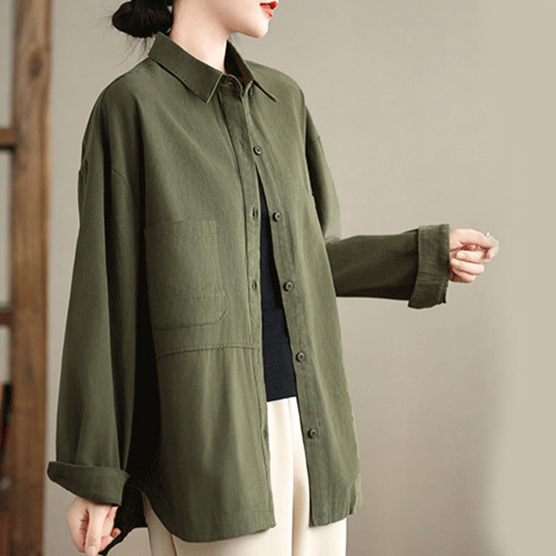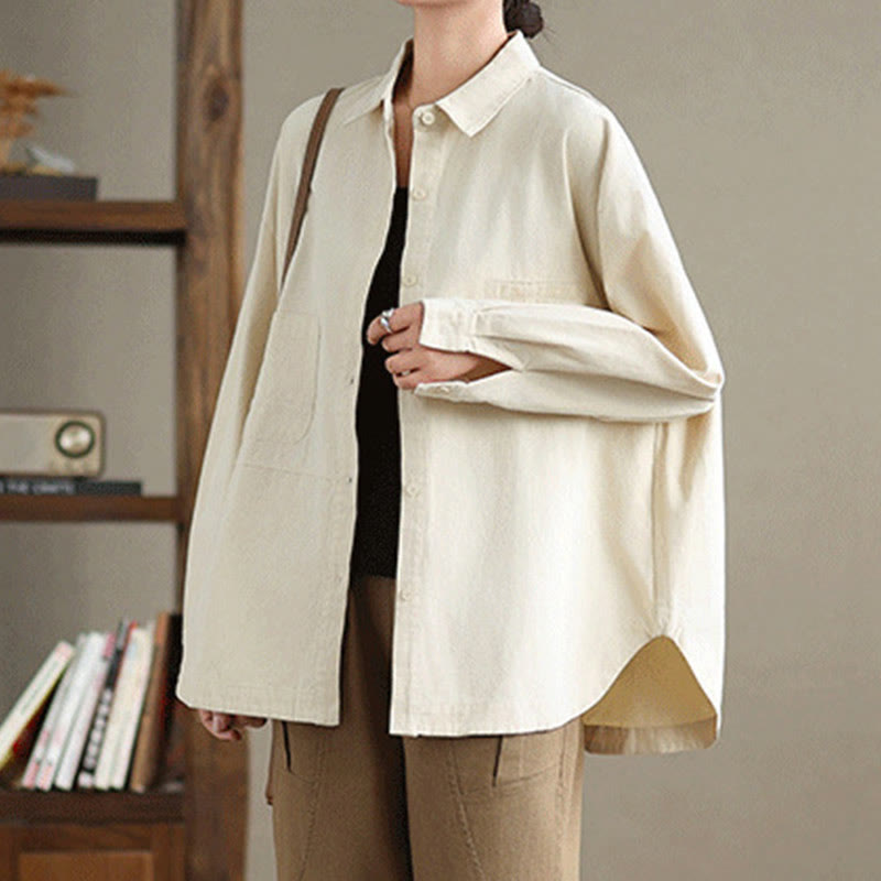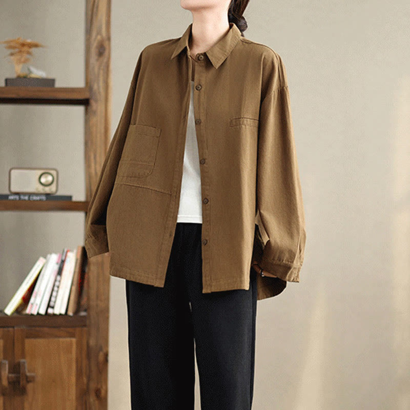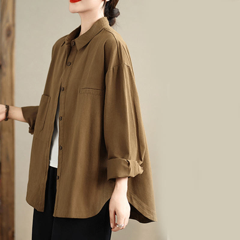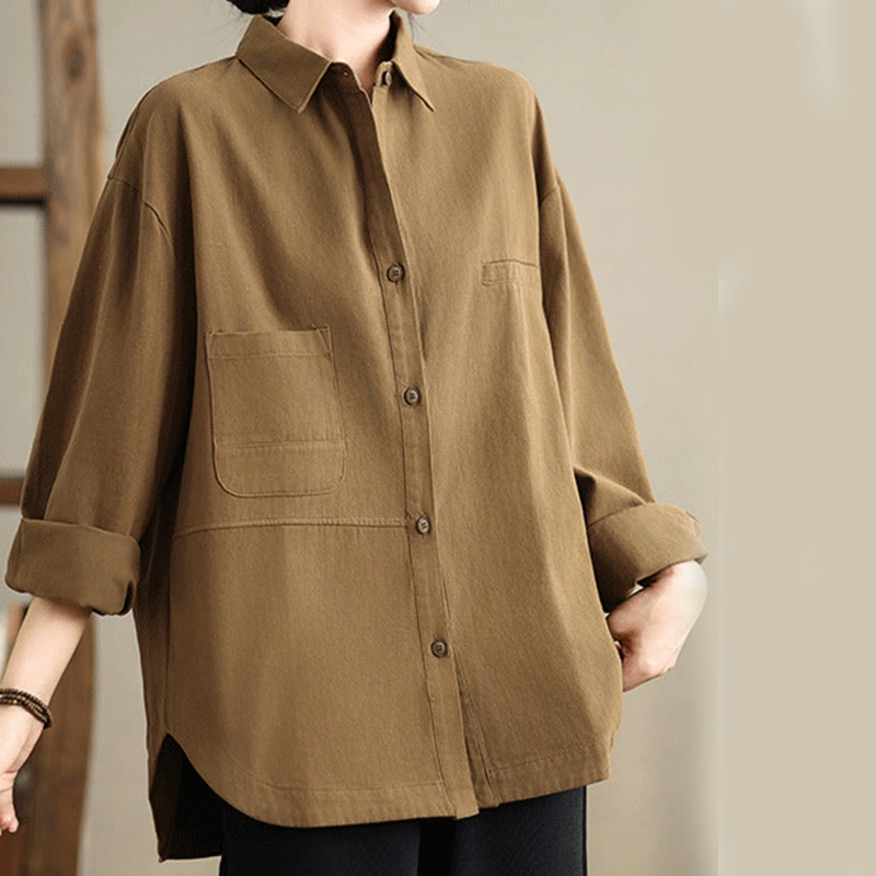 Buddha Stones Lässiges, schlichtes Langarm-Damenhemd aus Baumwolle mit Taschen - image 1