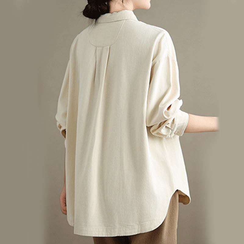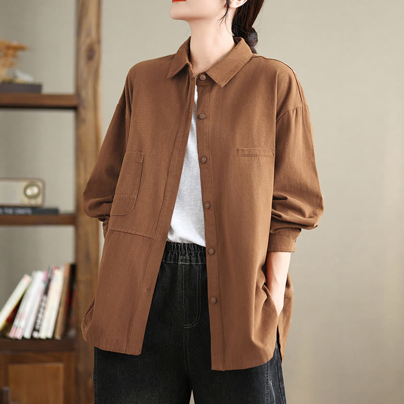 Buddha Stones Lässiges, schlichtes Langarm-Damenhemd aus Baumwolle mit Taschen