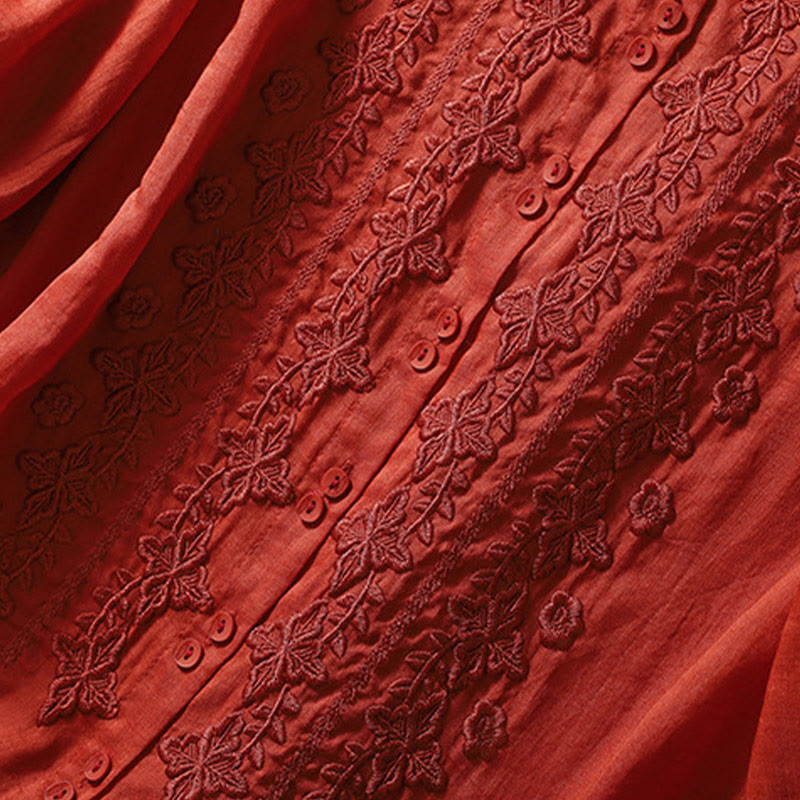Buddha Stones Sommer Einfarbig Knopf Stickerei Blumenmuster Dreiviertelärmel Revers Baumwolle Leinen Damenhemd - Rot - US12, UK/AU16,EU44 (2XL) - image 19