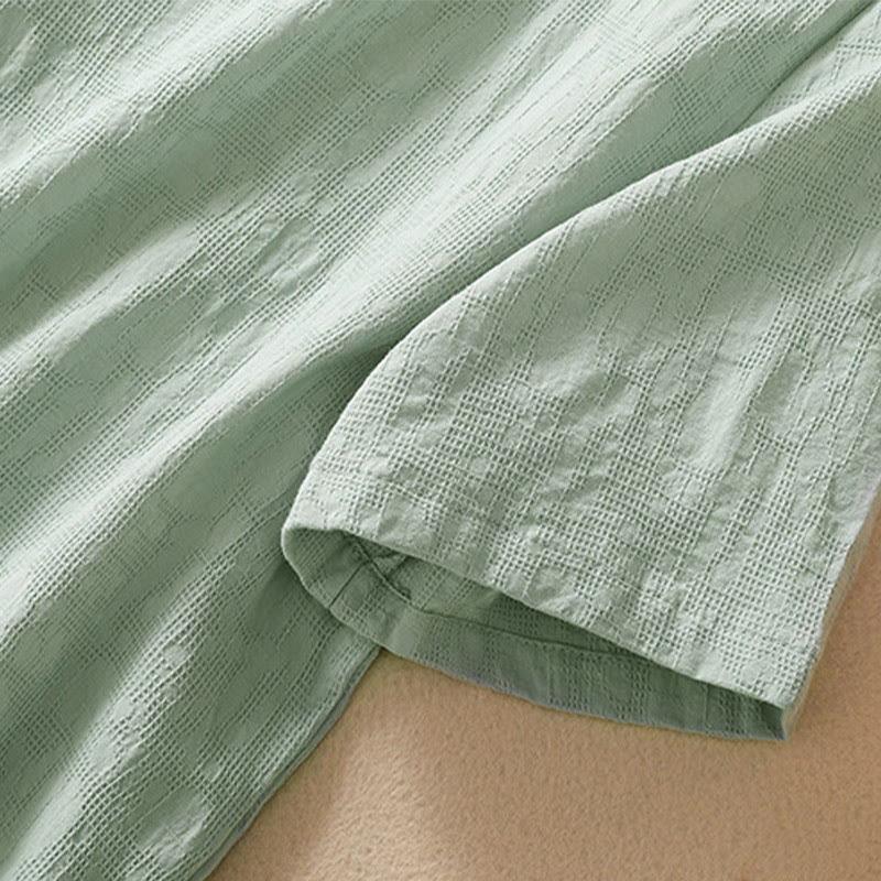 Kurzärmliges Baumwoll-Leinen-Hemd mit Buddha-Steine-Pflaumenblüten-Stickerei und Froschknopf