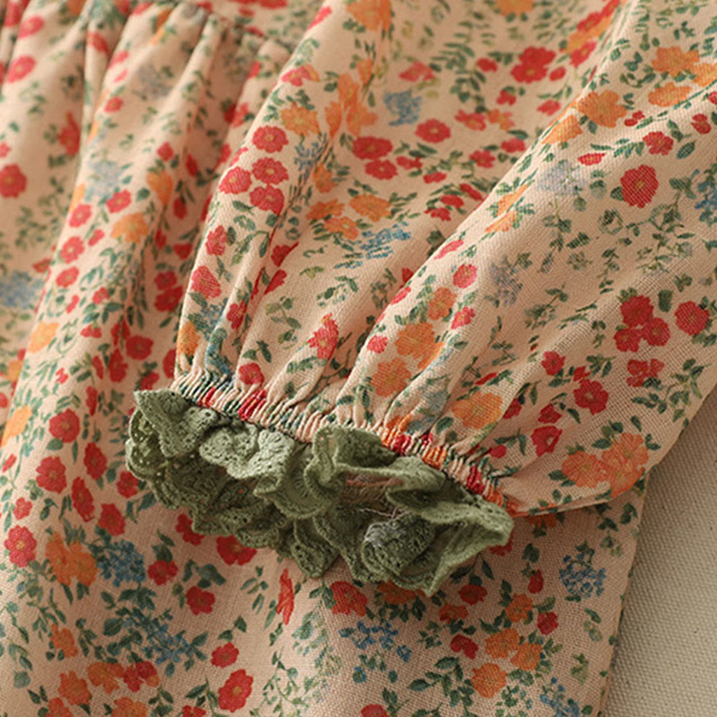 Buddha Stones – Lässiges Midikleid aus Baumwolle und Leinen mit Blumenspitze, Rundhalsausschnitt und langen Ärmeln und Taschen