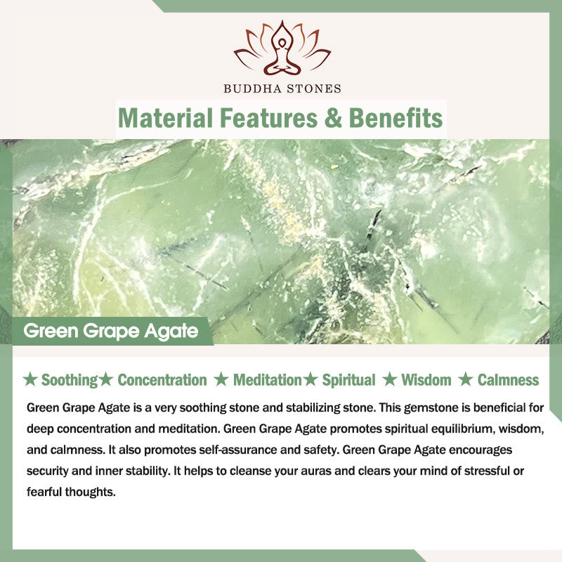 Grüner Traubenachat ist ein sehr beruhigender und stabilisierender Stein. Dieser Edelstein fördert tiefe Konzentration und Meditation. Grüner Traubenachat stärkt das spirituelle Gleichgewicht, Weisheit und innere Ruhe. Er fördert außerdem Selbstvertrauen und ein Gefühl der Geborgenheit. Grüner Traubenachat schenkt Sicherheit und innere Stabilität. Er hilft, die Aura zu reinigen und den Geist von stressigen oder ängstlichen Gedanken zu befreien.