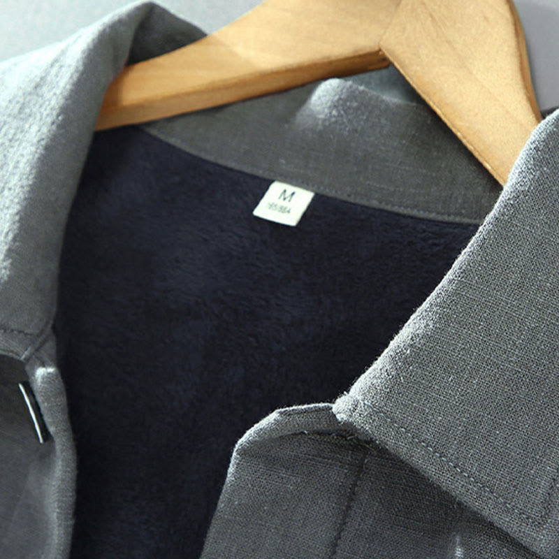 Buddha Stones Herren-Jacke, einfarbig, langärmlig, mit Thermo-Fleece gefüttert, Ramie-Leinen-Baumwoll-Jacke mit Taschen - image 1