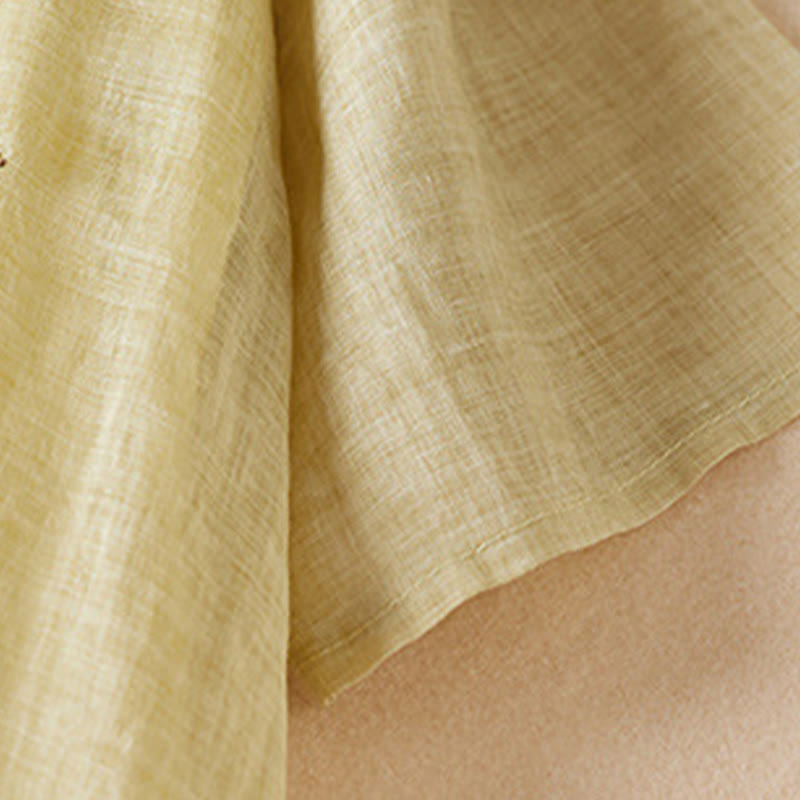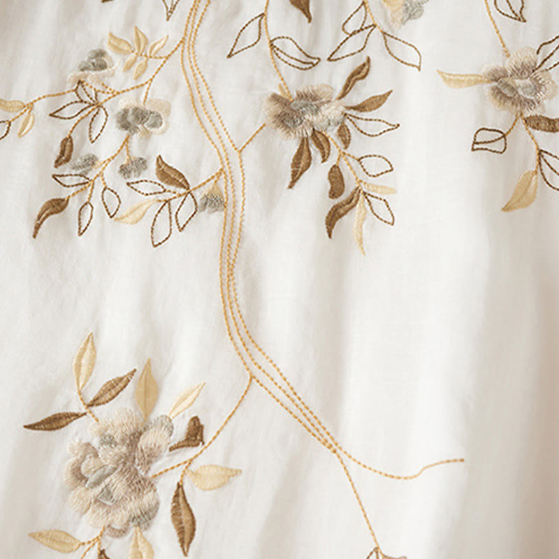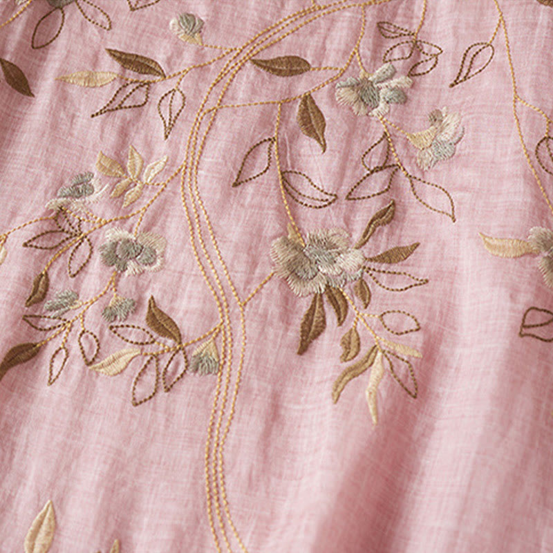 Buddha Stones – Midikleid aus Baumwollfaser mit besticktem Blattmuster, Rundhalsausschnitt und halblangen Ärmeln