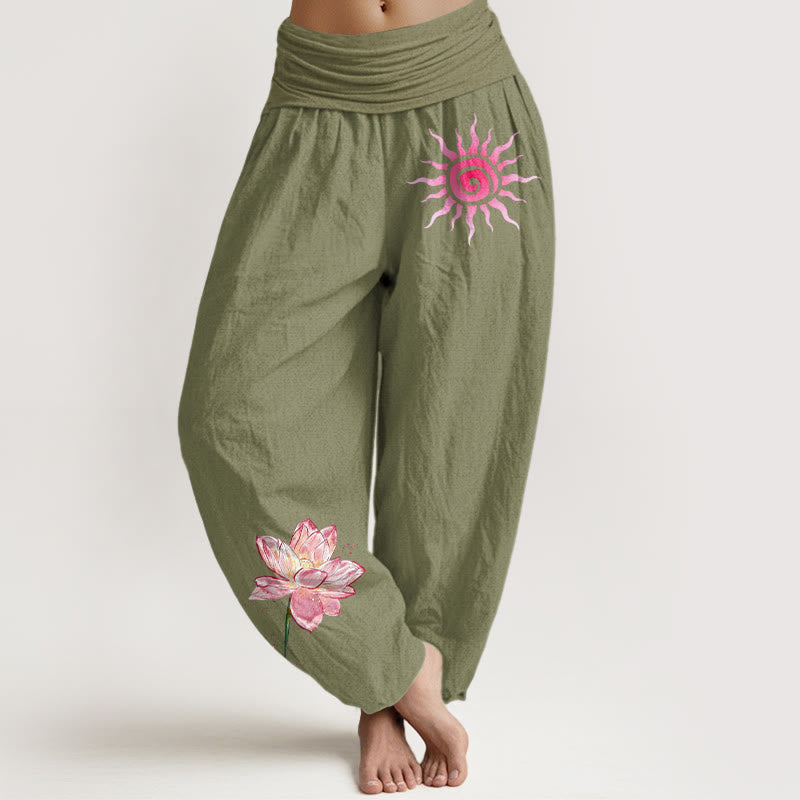 - Design: Die Muster dieser Haremshosen zeigen Sonne und Lotusblume mit tiefgründiger Symbolik. Das Sonnenmuster rechts besticht durch sanfte Linien; seine Spiralform symbolisiert Vitalität, Energie und Neubeginn, während der Farbverlauf eine warme Ausstrahlung verleiht. Das Lotusmuster links steht für Reinheit und Wohlstand; seine geschichteten Blütenblätter und die sanften Farben unterstreichen die natürliche Eleganz und den fließenden Übergang eines Aquarells. Die Kombination dieser beiden Muster erzeugt einen harmonischen visuellen Rhythmus voller Lebendigkeit und tiefgründiger Symbolik.