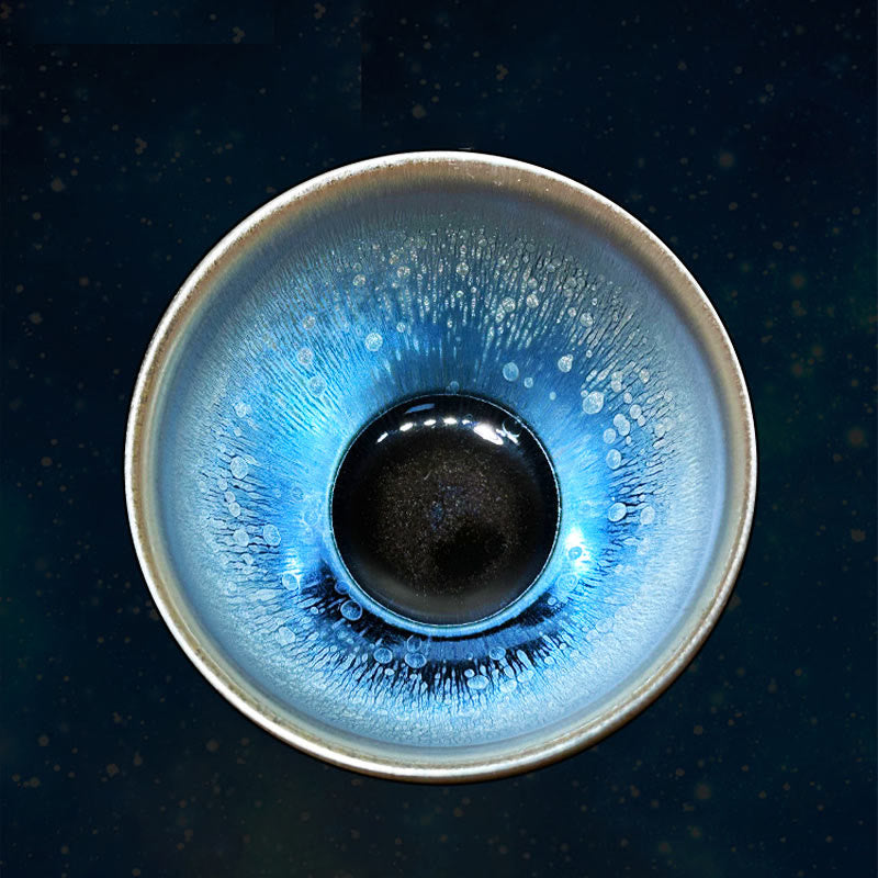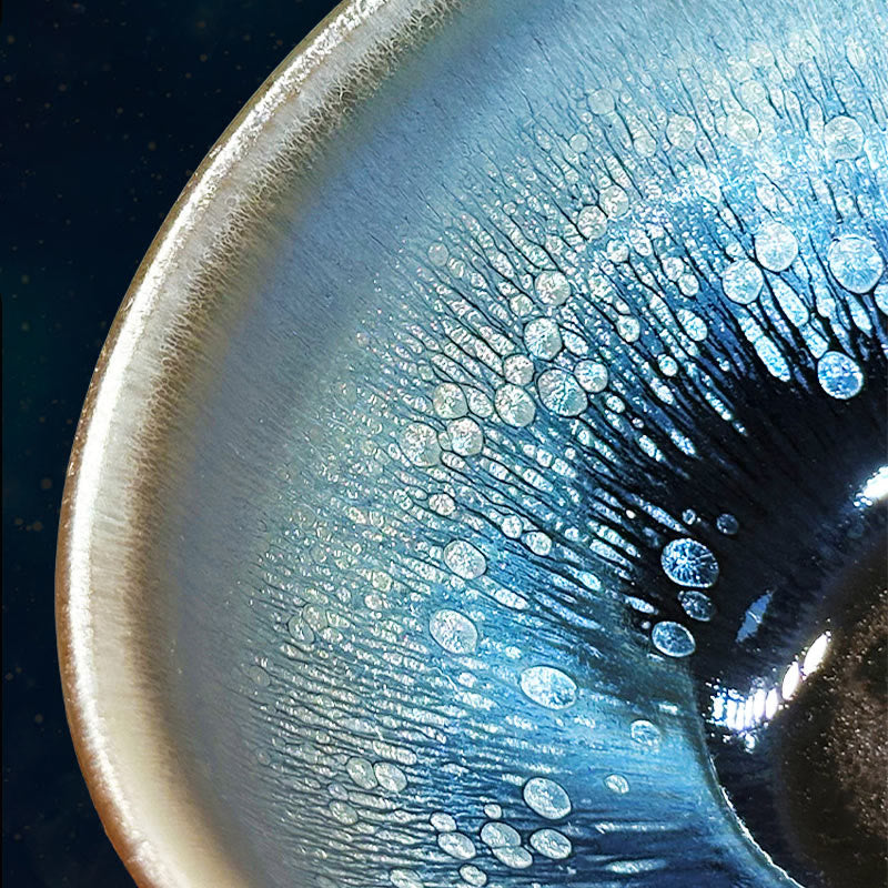 Jian Zhan ist an seinem dunklen Eisenkörper und den einzigartigen Glasurmustern zu erkennen. Alle für die Herstellung von Jian Zhan verwendeten Materialien sind rein natürlich. Die Glasurflüssigkeit besteht aus Pflanzenasche, und der Ton wird in Jianyang, seinem Herkunftsort, abgebaut. Da sowohl die Glasur als auch der Ton in Jianyang einen hohen Eisengehalt aufweisen, entsteht durch das stunden- oder sogar tagelange Brennen bei hoher Hitze eine Vielzahl von Mustern in Farbe und Form.