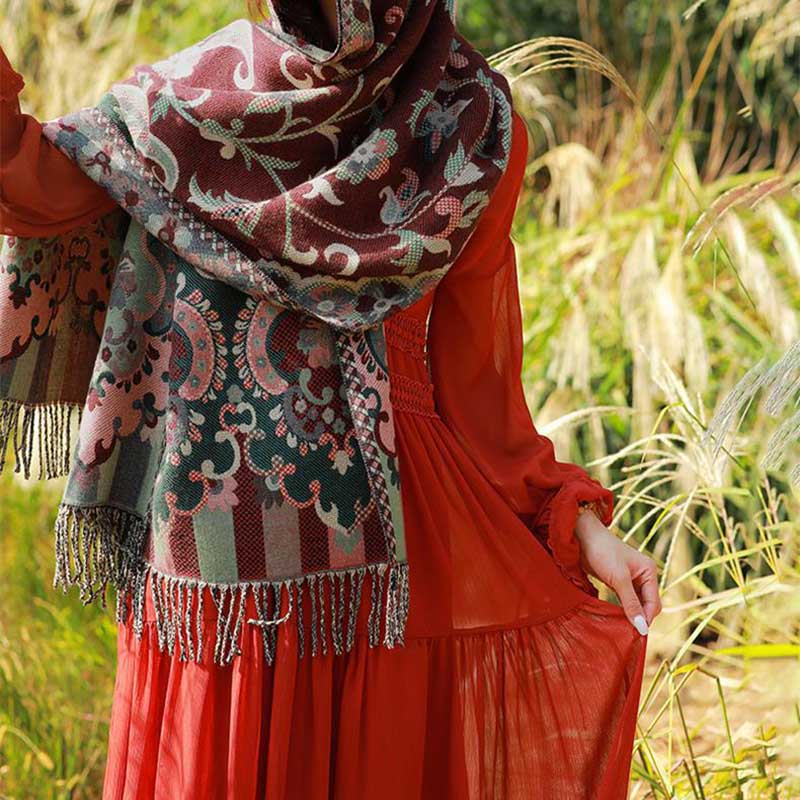 Buddha Stones, tibetische Blumen, Blätter, Zweig-Design, Quastenschal, gemütlicher Reiseschal - Dunkelrot - image 0