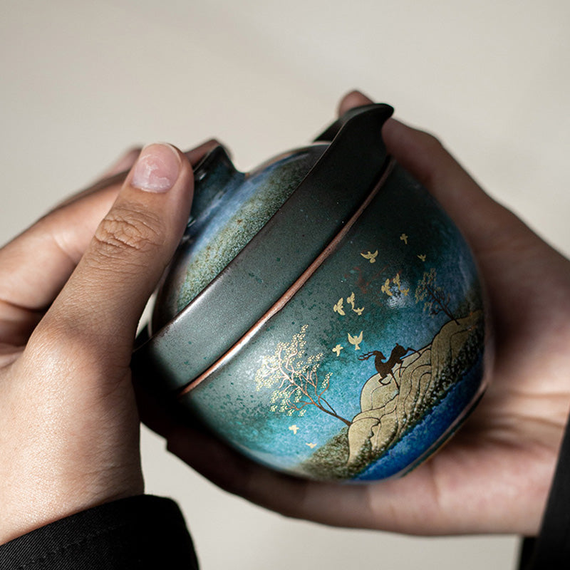 Buddha-Steine, Keramik-Teetasse, Hirsch, Bergbäume, schöne Katze, schwarze Teetasse mit Deckel und Beutel